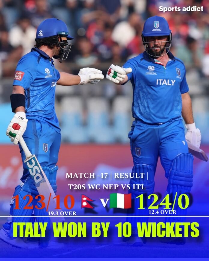 Mumbai, 12 February 2026 — In a sensational result at the ICC Men’s T20 World Cup 2026, the Italy National Cricket Team recorded a historic victory over the Nepal National Cricket Team in their Group C clash at Wankhede Stadium, Mumbai today.
